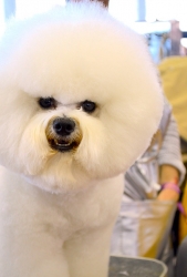 The Bichon Frise is a small, sturdy dog with a distinctive powder-puff appearance. They have a double coat, with a soft and dense undercoat and a curly outer coat that gives them their characteristic fluffy look. Their coat is typically pure white, though some may have traces of apricot or cream around the ears. Bichons have dark, round eyes that give them a lively and expressive appearance, and their ears are drop-shaped, covered in long, curly hair.