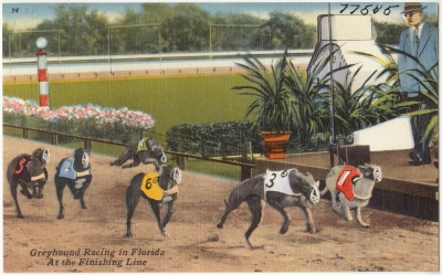 Ancient Egyptian Tombs and Assyrian monuments show that the dog we call the English Greyhound existed 4000 years ago. Like the Deerhound, The greyhound is an extremely fast dog of aristocratic bearing. His aerodynamic shape equipts him perfectly for the pursuit of dear or wild boar. One source warns that greyhound's must not be allowed to run free, as they will attack chickens, cats, rabbits, and of the small domestic animals. Greyhound racing became a popular sport in the late 16th century. In the 1920s the sport caught on in the United States.